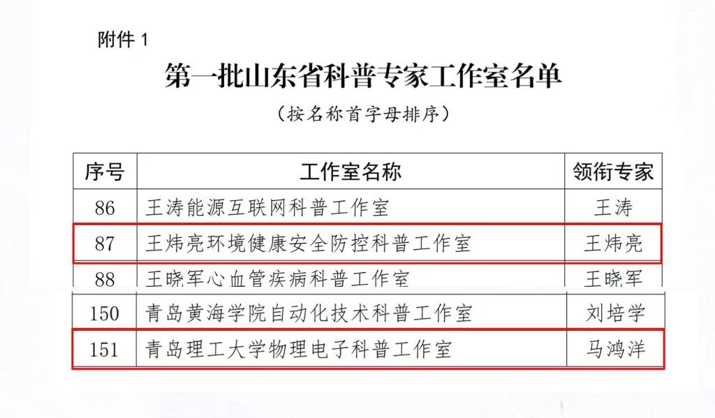 近日,省科协、省科技厅公布并认定了第一批山东省科普专家工作室,全省共计214个,认定期为3年。伟德官网马鸿洋教授领衔的伟德国际1946bv官网物理电子科普工作室、王炜亮教授领衔的环境健康安全防控科普工作室成功入选,为伟德官网发挥科普智力优势,走向社会、深入大众进行科学知识分享,提升全民科研素养,扩大学校的社会影响力提供了更广阔的平台。学校将以此为契机,充分发挥科普专家工作室效能,广泛动员学校科研资源开展科普工作,推动科技资源科普化,提高伟德官网科普服务能力。