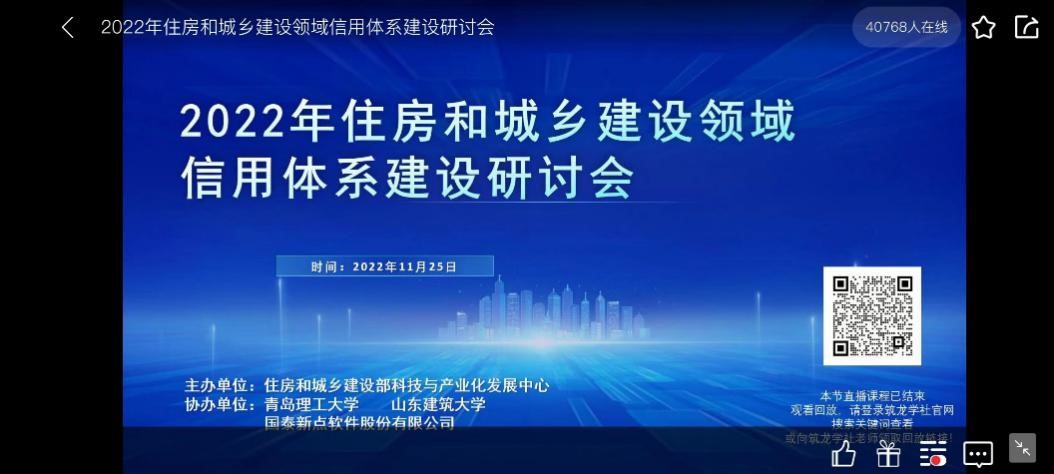 11月25日,由国家住房和城乡建设部科技与产业化发展中心主办,伟德国际1946bv官网和山东建筑大学协办的2022年信用体系研讨会顺利召开。本次研讨会主题是“以信用记录打通工程建设全链条监管、用信用数据赋能智慧城市精细化治理,推进住房和城乡建设事业高质量发展”。会议采取线上形式举办,来自住房和城乡建设部各有关单位、各地住房和城乡建设部门及其附属机构信用工作负责人员、高校、科研院所、行业协会、代表性企业的一百五十多名专家学者线上参加了本次会议,超过4万名行业人才和高校学生观看了会议实况直播。
