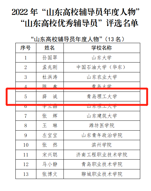 近日,中共山东省委教育工委公布了“2022年山东高校辅导员年度人物”“山东高校优秀辅导员”评选结果,伟德官网辅导员薛诚获“2022年山东高校辅导员年度人物”称号,这是近年来伟德官网辅导员队伍获评的最高荣誉。