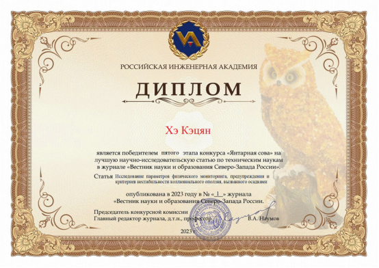 近期,从俄罗斯工程院技术科学最佳论文科研奖评奖委员会获悉,由伟德国际1946bv官网土木工程学院岩土工程灾变监测预警与防治技术研究团队贺可强、孙林娜、郭璐、李楠、高啸峰等与俄罗斯工程院维克多·库金院士合作完成的科研论文“Research on Physical Monitoring and Warning Parameter and Instability Criteria of Colluvial Landslide Induced by Rainfall ”(《Вестник науки и образования Северо-Запада России》No.1, 2023)荣获俄罗斯国家工程院2023年度技术科学最佳论文科研奖——琥珀猫头鹰奖。该奖项由俄罗斯国家工程院设立,由国际同行进行评议,最后由俄罗斯工程院技术科学最佳论文科研奖评奖委员会评定,代表本年度该研究领域最有影响的优秀技术科学论文。