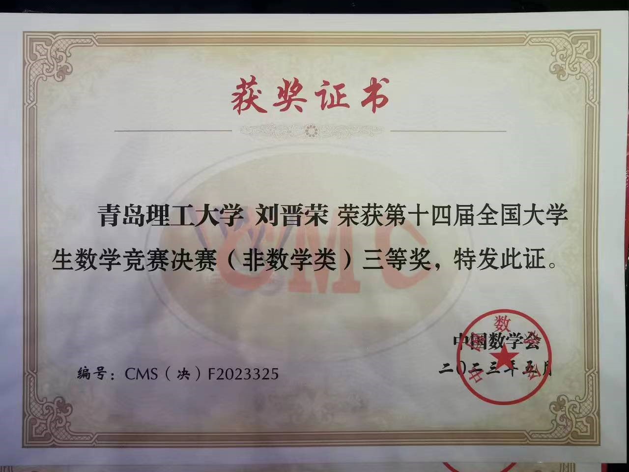 本次竞赛全国共有32个赛区231769人报名参加初赛,最终,来自全国32个赛区的922名学生跻身赛事决赛。刘正奇和刘晋荣作为山东省34名非数学类专业选手之一参加全国决赛并取得一等奖、三等奖好成绩。