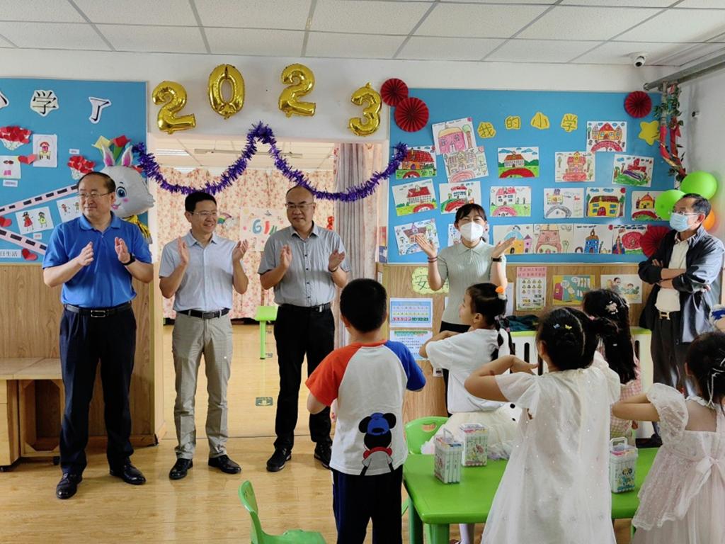 6月1日上午,党委常委、统战部部长陈伟在工会、后勤管理处负责同志陪同下来到学校幼儿园,与幼儿园师生欢度“六一”,为孩子们送上节日祝福,并向辛勤工作的教职工表达诚挚问候。