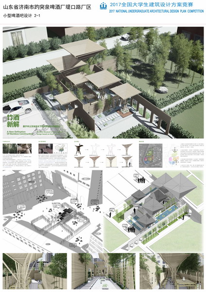 由王少飞老师指导,本科五年级学生罗练、闫欢、林汝佳、王宏伟提交的作品《山东省济南市趵突泉啤酒厂堤口路厂小型啤酒吧设计》从参赛作品中脱颖而出,荣获银奖。作者利用传统酒樽进行创想,提取樽的形象代表文化,将其简化成其三角变力的结构并且使用竹材建造基本形体,最终完成蕴藏文化底蕴和包容的作品。设计理念旨在通过主材建立建筑与文化之间的联系,将这种新型发展模式重新注入竹子这种传统材料中,让其作为中国传统建筑材料的代表来发展文化,冲出国门走向世界。