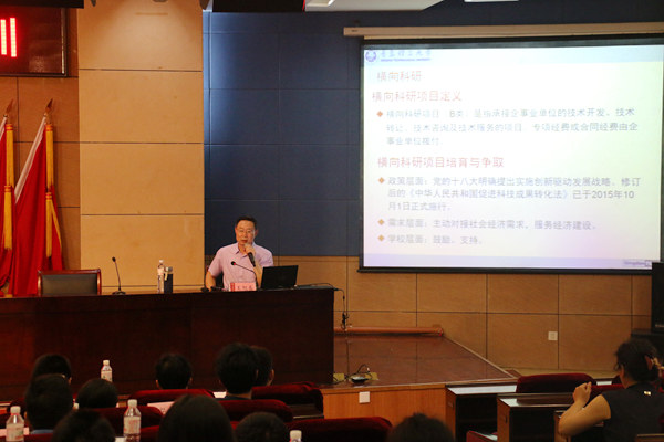 科技处处长王旭春作“科研政策规定,科研业务、项目成果申报流程”的专题报告。