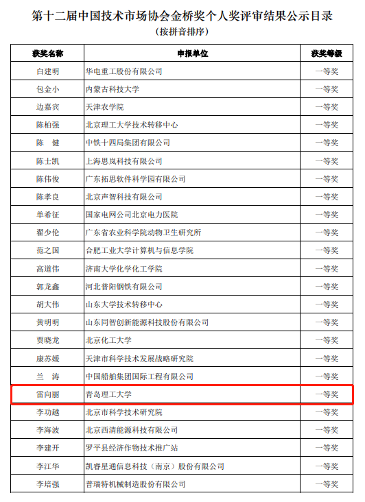 近日,中国技术市场协会公示了第十二届中国技术市场协会金桥奖评审结果,伟德官网科技处雷向丽老师荣获个人一等奖。