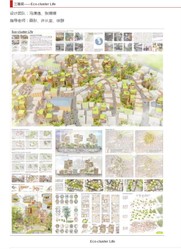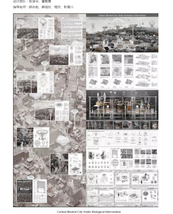 其中,由郝赤彪、解旭东、程然、耿雪川等老师指导,本科生张泽华、董智勇提交的作品《Carbon Neutral City Under Biological Intervention》荣获二等奖;聂彤、许从宝、徐翀等老师指导,本科四年级学生冯潇逸、张媛媛设计的方案《Eco-cluster Life》荣获三等奖;许从宝、聂彤、徐翀老师指导,本科四年级学生邹雪、朱笛、段彦吉设计的方案《CHAINS OF COMPLEXITY:THE COMPINATION OF NATURES,SOCITEY AND ECONOMICS》,郝赤彪、解旭东、程然、耿雪川老师指导,本科四年级学生张祥麟、吴文珂、陈伟东设计的方案《Make the Ridge Green Again》,郝赤彪老师指导,本科三年级学生黄静雯、宋易、张旭设计的方案《Do-kology=dok+ecology》,张洪恩老师指导,本科三年级学生冯佳璐、叶靖、王天颖设计的方案《THE CITY AORTA》等获得荣誉提名奖。这是建筑学院学子自1999年获世界第11名、2014年获世界前15名之后,又一次取得的优异成绩,成为该项赛事在一次竞赛中获奖最多的高校之一,为中国学子在世界上赢得了极大的声誉。