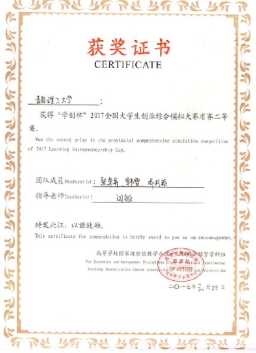 本次比赛由高等学校国家级实验教学示范中心联席会经管学科组主办,采用创业虚拟经营系统《创业之星》作为网络竞赛平台,进行4轮虚拟季度的创业模拟经营。真实再现社会环境中创业、就业所经历的种种问题。在此过程中,学生能够了解企业各个业务单元及相关关系,体验企业各种角色的岗位职责与决策模式,感受市场竞争及企业应对的过程,并强化团队协作精神,让大学生在无成本、无风险的情况下接受社会创业与就业的考验。比赛软件采用只能手环模板,由系统自动评分,最终形成竞赛名次。伟德官网商学院共3支队伍参加省赛,其中KING-梦一队(张卓异、韩雪、乔凡菲)和KING-梦二队(刘杰、魏欣、张悦玲)在闫敏老师指导下,集思广益、认真核算、谨慎决策,经过激烈角逐,最终获得“学创杯”2017全国大学生创业综合模拟大赛省赛二等奖。