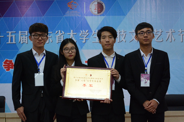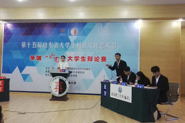 由机制143班王振亚、房产141班张黎、道桥151班田雪、土本152班胡敬东四名成员组成的临沂校区辩论队在赛场上哲思巧辩、旁征博引、字字珠玑,充分展现了校区学子良好的综合素质和优良的团队合作精神,其中王振亚同学以其优异表现获得“优秀辩手”称号。(学生工作部)
