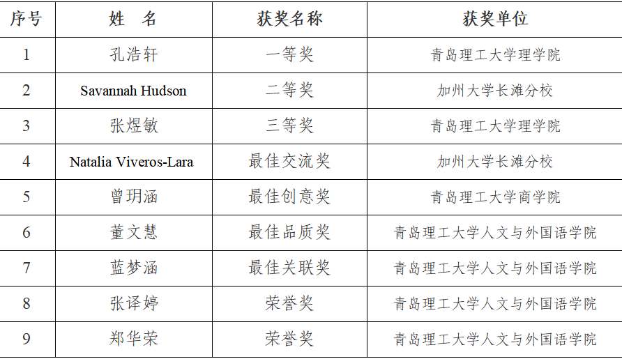 在本次活动中,组委会共设置一、二、三等奖及最佳交流奖、最佳创意奖、最佳品质奖、最佳关联奖7个奖项。经评审委员会评审,伟德官网学子凭借扎实的专业素养和跨文化沟通能力,在中外结对队伍中脱颖而出,成功斩获其中6项大奖,获奖数量和质量均创历史新高。中华人民共和国驻洛杉矶总领事馆、长滩-青岛友城委员会、中美两校等均对此次比赛给予了高度评价。(撰稿:李爱晶、冯志国;摄影:王云霞;审核:张鹏、郭印)