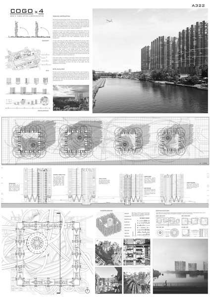 董智勇、姜卓群、许大伟、马子淇共同完成的设计作品《COGO x4》以其新颖的设计理念、大胆的设计创意和对于建筑未来的美好畅想获得了评委团的一致认可在此次竞赛中荣获三等奖。这个项目设定在杭州工业园,依托阿里巴巴等大型互联网企业,为中小企业设计了一个崭新的办公场所。COGO采用了全新的运营模式。整个建筑在框架基础上建造出灵活的建筑系统。整个系统是由不同等级的公路网络结合混凝土框架。各大框架分为等大空间模块,企业可以选择不同类型的组件和不同数量的模块建造预制建筑。将水平交通系统为垂直系统,将各个企业相互联系起来,为他们提供更多的机会。