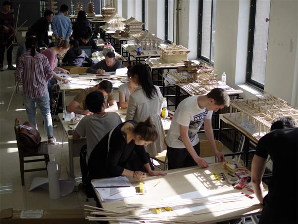 开幕式后,双方师生来到项目基地---青岛雕塑园进行调研和测绘,又到毗邻雕塑园的青岛规划展览馆聆听了刘崇对青岛建筑发展沿革的讲解。调研后回到学校,双方师生听取了建筑历史研究所所长赵琳教授关于中国古代建筑构造的精彩讲座。德国学生还亲手拆装了斗拱模型,体现出对中国木构智慧的浓厚兴趣。