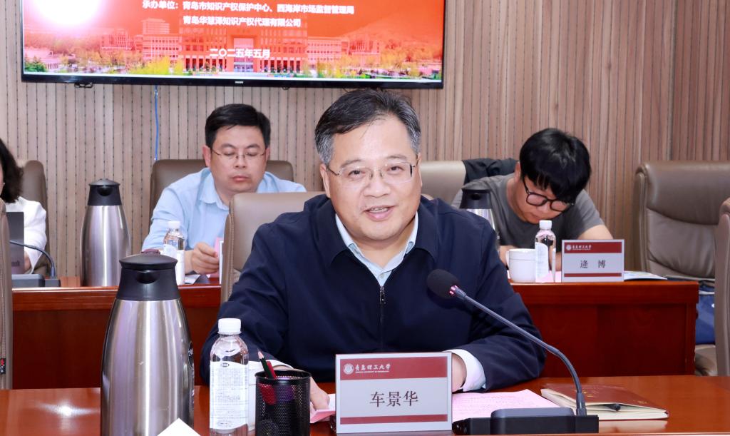 学校党委副书记车景华、青岛市市场监督管理局局长张咏雁和山东省国家知识产权保护中心副主任祁新宇等领导出席会议,会议由学校党委常委、副校长陈连军主持。