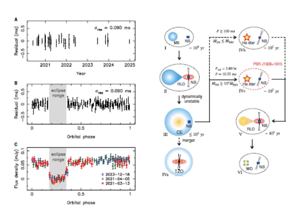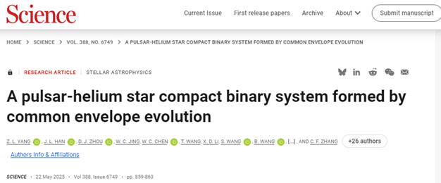 这是人类首次探测到这类稀有的脉冲星-氦星系统,这一发现在研究共有包层演化、毫秒脉冲星起源、中微子冷却的超爱丁顿吸积和低频引力波源等方面具有极高的科学价值和科学意义。(论文原文链接地址:https://www.science.org/doi/10.1126/science.ado0769)(撰稿:许坤、姜龙、邢元元;审核:孔亮、刘俊伟)