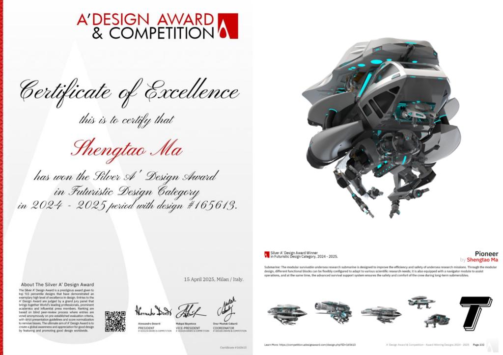 近日,2025年意大利A设计奖(A'Design Award & Competition)获奖名单正式揭晓。艺术与设计学院2024级设计专业研究生马圣涛在指导教师王春鹏、朱宏轩、赵光明的指导下,凭借作品《Pioneer Submarine》从全球参赛作品中脱颖而出,斩获2024-2025年度意大利A设计奖银奖。这一国际殊荣不仅是对学子个人创造力的高度认可,更彰显了学院设计教育的国际影响力。