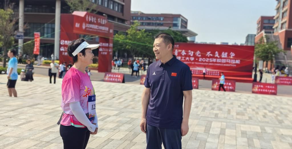 仪式前,杨赟与参加活动的师生和校友进行了现场交流,向回母校参加马拉松活动的校友表示热烈欢迎,向一直以来关心支持学校建设发展的广大校友表示感谢,预祝各位校友在活动中跑出优异成绩,也期待广大校友与母校保持密切联系、互促融合,共同跑出高质量发展的加速度。
