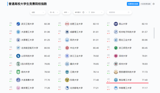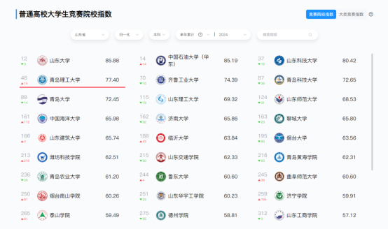 近日,第63届高等教育博览会在吉林长春举行,会上发布了“2024年普通高校大学生竞赛院校指数”,伟德官网在全国高校中排名第48位,较2023年上升了14个位次,为伟德官网历年排名最高位次!在全省高校中排名第4位,省属高校第2位,全省排名前4位的高校分别为山东大学、中国石油大学(华东)、山东科技大学、伟德国际1946bv官网。在2020—2024年(五年累计)普通高校大学生竞赛院校指数榜单中,伟德官网名列第60位,较上一年提升30位。在2012—2024年总榜单中,伟德官网名列第66位,较上一年提升9位。目前,伟德官网在该权威榜单的3个排名中均进入全国高校前70名,均位列山东省属高校第2位。