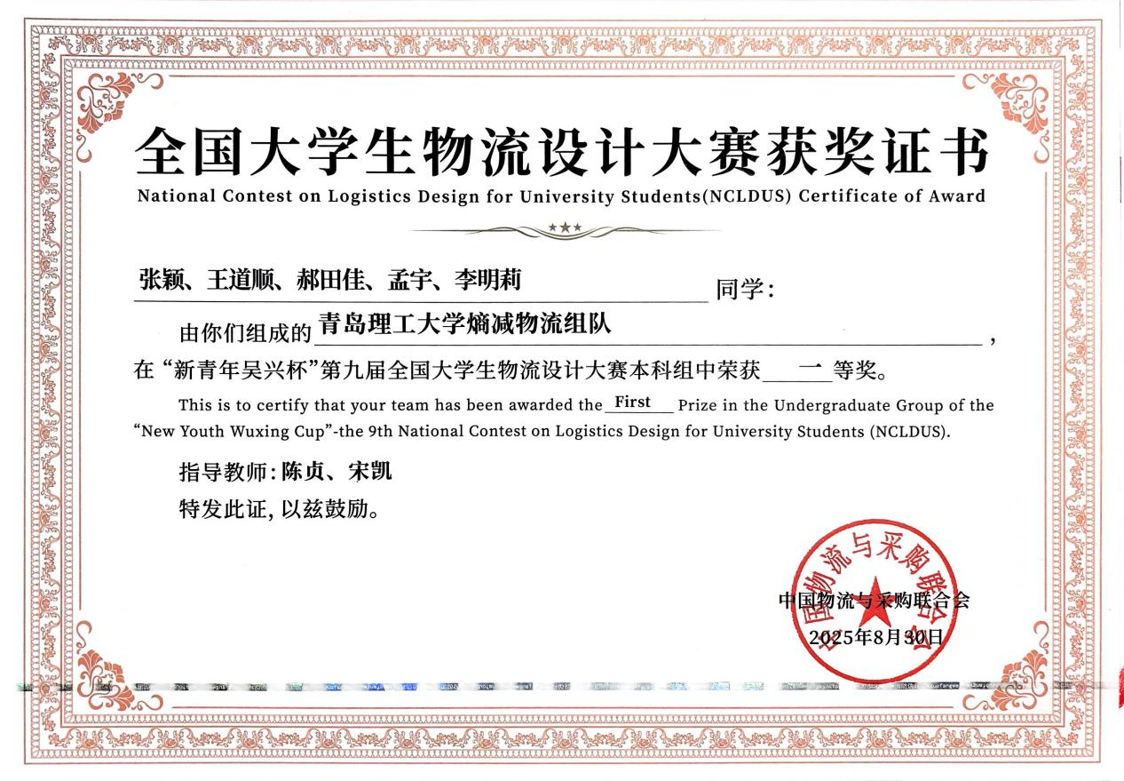 全国大学生物流设计大赛是国内物流领域最具专业性、权威性与实用性的学科竞赛,被列入教育部“质量工程”建设项目。本届大赛自2025年4月启动以来,吸引了全国375所高校的757支队伍报名参赛,最终90支本科队伍、30支研究生队伍晋级全国决赛。校区高度重视,迅速组建专项备赛工作组,不断打磨参赛作品,逐项提出优化方案,集中指导答辩全过程,为成绩的取得做足功课。决赛现场,团队成员沉着冷静、配合默契,凭借清晰的逻辑、详实的数据和生动的演示,赢得评委一致好评。最终,临沂校区2022级物流管理专业学生张颖、王道顺、郝田佳、孟宇、李明莉组成的“熵减物流组队”(指导教师:陈贞、宋凯)斩获总决赛一等奖。