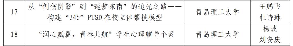 心理健康教育指导典型案例2项(全省共88项),土木工程学院教师王鹏飞、杜诗琳的案例“从‘创伤阴影’到‘逐梦东南’的追光之路——构建‘345’PTSD在校立体帮扶模型”。大学生心理健康教育中心教师杨波、刘安庆的案例“‘润心赋翼,青春共航’学生心理辅导个案”。两个案例凭借科学的干预模式、显著的辅导成效和重要的示范意义,获得了专家评委的高度认可。