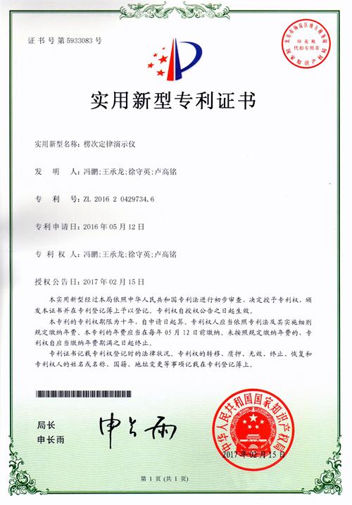 日前,理学院冯鹏、王承龙等同学在物理实验室邓剑平等老师指导下申请的国家实用新型专利获得了授权,专利名称为“楞次定律演示仪”(专利号:201620429734.6)。