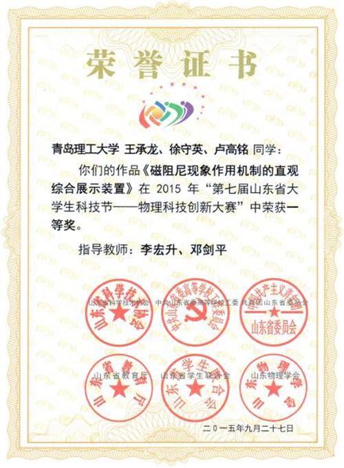 该专利的雏形是基于王承龙等同学在山东省大学生物理科技创新大赛获得一等奖的作品,在2016年省本科教学状态评估期间,王承龙同学用该作品所做的展示获得了评估专家的高度评价。