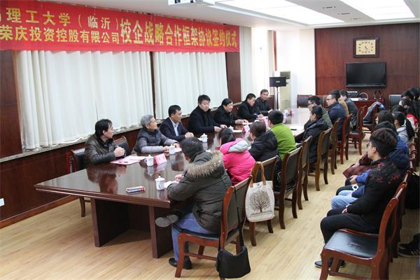 1月10日下午,临沂校区与山东荣庆投资控股有限公司战略合作协议签约仪式在办公楼二楼会议室举行。学校副校长李国华、荣庆公司董事长张玉荣在协议书上签字,仪式由校区副校长朱卫东主持,荣庆副总裁李明、人力资源部部长苗志伟和管理工程系主任荀志远、副主任陈博出席,管理工程系师生代表参加。