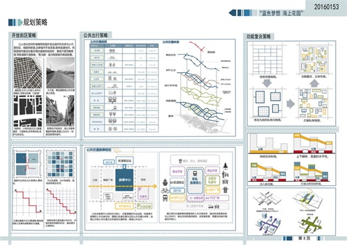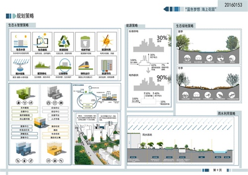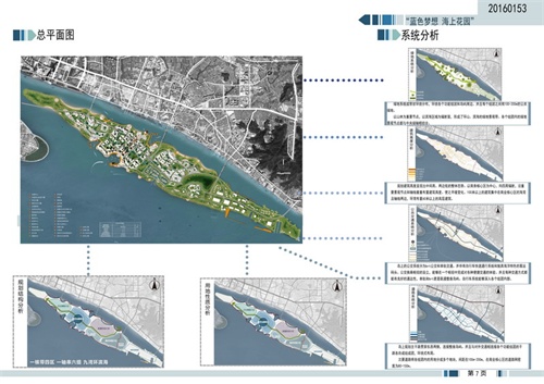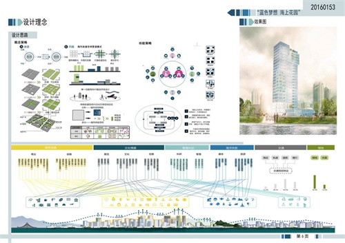 建筑学院竞赛团队结合舟山因海而生、因舟而名的地理现状和舟山人敢于勇立舟山、与世界交通的精神现状,以“蓝色梦想·海上花园”为名,让岛屿真正地生活在海洋花园中,突出舟山的海洋特性。以生态环境与生活空间的渗透与共融为设计思路,挖掘潜在绿化空间,通过各个地块间大片绿地和自然水系的沟通,营造出亲近自然贴近自然的良好环境,打造在山在海在地活力特色的滨海区域;落实公交优先政策,并重慢行系统,自行车道和慢性道平面上交叉,空间上又彼此分开。用开放的胸怀、理性而非诗意的态度来寻找乌托邦式的城市雄心,将自然观光海岸、交通性海湾、绿色健身海湾有机地结合在一起,相互协作,提高了土地利用效率和商务区的活力,凸显了土地混合利用1+1>2的价值。