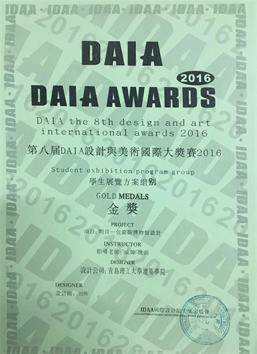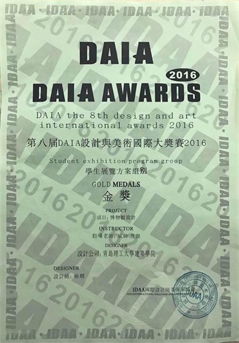 由伟德官网建筑学院成帅、沈源老师指导,由范玮、徐熠、刘伟同学分别设计完成的作品《博物馆设计》荣获第八届DAIA设计与美术国际大奖赛国际设计与美术大奖赛学生广告组别金奖(三项)。