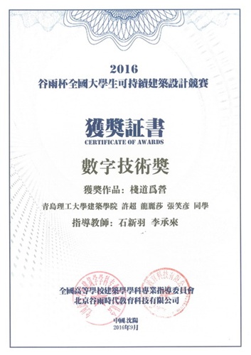 由石新羽、李承来老师指导,由许超、龙丽莎、张笑彦同学完成的作品《栈道为营》荣获2016年“谷雨杯”全国大学生可持续建筑设计竞赛数字技术奖。