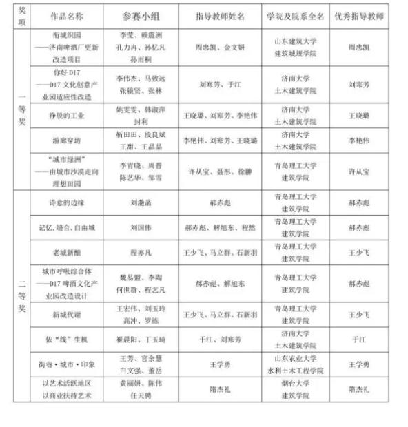 建筑学院师生在本次大赛中取得优异成绩,其中,由许从宝、聂彤和徐翀三位老师指导,李青晓、周晋、陈艺华和邹雪四位同学设计的《“城市绿洲”—由城市沙漠走向理想田园》斩获一等奖;由郝赤彪老师指导,刘滟菡设计的《诗意的边缘》,由郝赤彪、解旭东和程然老师指导,刘国伟设计的《记忆·缝合·自由城》,由王少飞、马立群和石新羽老师指导,程亦凡设计的《老城新酿》,由郝赤彪和解旭东老师指导,魏易盟、李陶、何世群和程艺凡设计的《城市呼吸综合体——D17 啤酒文化产业园改造设计》,以及由王少飞,马立群和石新羽老师指导,王宏伟、刘玉玲、高冲和罗练设计的《新城代谢》荣获二等奖;由于红霞和徐飞鹏老师指导,孙雨泉和马晓霞设计的《泉城故事·第 7 巷》,由郝赤彪和解旭东老师指导,孙佩琦和刘彤设计的《D17 文化创意产业园概念设计》,郝赤彪、解旭东和程然老师指导,张文泉、石逸之、张子期和耿胜男设计的《啤酒游乐园》,以及由王少飞、马立群、刘崇和张文辉老师指导,郭扬和戈设计的《管·工业复兴》荣获三等奖。