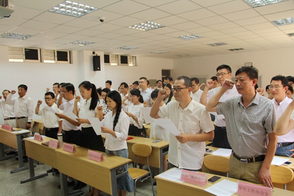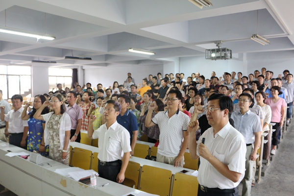 9月7日-9日,各学院分别组织全体教职工举行宣誓仪式。环境学院、计算机学院、外国语学院、通信学院、汽车学院等把“两学一做”学习会和宣誓仪式结合起来,组织全体教职工学习了《高等学校教师职业道德规范》及《教育部关于建立健全高校师德建设长效机制的意见》中的教师七条师德禁行,收看了《李保国同志先进事迹报告会》视频,讨论心得体会,并宣誓争做伟德国际1946bv官网的优秀老师。