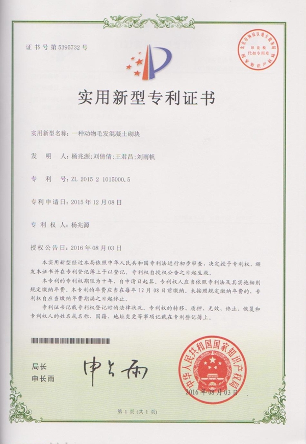 “一种动物毛发混凝土砌块”实用新型专利是在于德湖老师的指导下,王君昌、杨兆源等4名团队成员共同进行的创新。传统纤维混凝土以水泥浆、砂浆或混凝土作基材,以纤维作增强材料所组成的水泥基复合材料。团队成员一起进行了动物毛发对于混凝土性能影响的研究,并且研究出一种来源简单、成本较低、使用寿命长、可通过咬合结构减少水泥用量、不易开裂、具有较高的强度及韧性的动物毛发混凝土砌块。