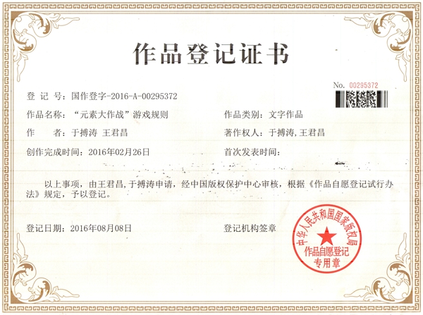 “元素大作战”文字作品登记涉及初、高中学生化学智力开发,为王君昌与一名高中生共同创作的一种创新教学方式。该作品首次提出化学游戏方式和教学理念,以最常见的化学元素为起点,穿插物质性质、化学性质、金属、非金属性等元素基本知识,通过用119张元素卡牌任意组合各类化合物、阴阳离子的方式,让学生更快的熟记各类常见化合物和阴阳离子组合方式,这些设计是一种全新的教学理念,对于教学方式和学习方式的变革有着重要意义,更符合国情、更易于推广。
