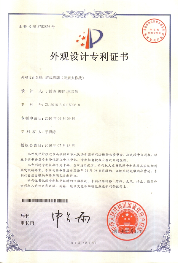 “元素大作战游戏纸牌”外观设计专利是以文字作品为依托进行的人物形象、文字以及版面的设计。依据各化学元素的性质对每一元素进行人物形象设计,共包含组件35个,包括元素、反应条件牌面正反面、外包装等。该外观设计灵巧生动,适合初、高中学生人群使用,对于化学教育方式的创新有重要意义,适合大面积推广。