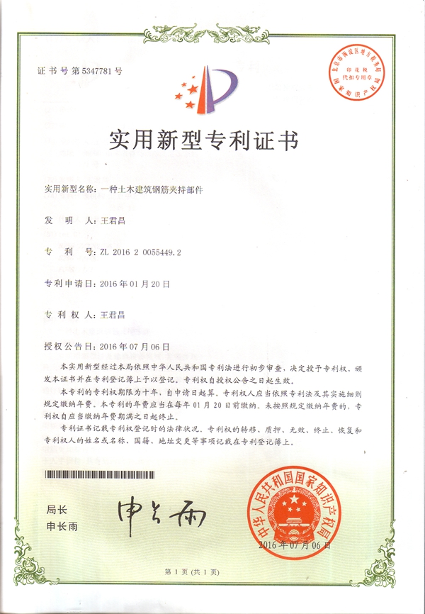 其中,“一种土木建筑钢筋夹持部件”实用新型专利为王君昌独立申请,涉及建筑现场施工领域。该专利是一种便于夹断粗硬条状物、能使夹取条状物如钢筋更加稳定牢固、能便于人手握持、具有结构简单、操作方便、经济适用的优点的土木建筑钢筋夹持部件。完全改进了原先的夹持头部和手柄,实现了更加稳定牢固、能便于人手握持并且操作方便、经济适用的土木建筑钢筋夹持部件。