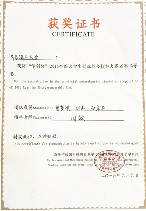近日,“学创杯”2016年全国大学生创业综合模拟大赛省赛落下帷幕。伟德官网商学院曹梦琪、刘杰、张卓异同学组成的团队在闫敏老师指导下,获省赛二等奖。