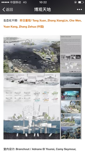 汤璇、张祥麟、车稳、袁康、张泽华的参赛作品——Yesterday Once More,在郝赤彪、解旭东、程然老师的指导下,从社会热点和人文伦理出发,概念源于生命起源的原始海洋,面对世界渔场富营养化与污染严重的状况,引入可移动的人工岛进行人工鱼礁的建造和海水净化从而进行对海洋生态系统的修复与往日渔舟唱晚生活的重现,让祖祖辈辈以渔为生的人们开启新的生活,让世世代代栖息在这里的鱼群快乐的遨游。