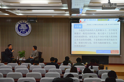 本次比赛共分为三个部分,主题演讲、案例分析、谈心谈话与情境再现。在主题演讲环节,参赛选手结合对职业的理解、专业特长,并与实际工作相联系,从独特的视角介绍自己并展示工作特色。案例分析针对现场随机抽取的案例题目进行分析,给出自己的解决办法以及从中得到的启示。案例内容涉及学生工作方方面面,诸如学生的学业问题、学生就业问题、学生心理问题等。各位参赛辅导员坚持解决思想问题与解决实际问题相结合,坚持教育学生与服务学生相结合,联系自己的工作经验,做出了精彩的分析和解答。谈心谈话环节,参赛选手们在规定的时间内,对学生遇到的各种问题进行现场处理。题目涵盖新生学业规划、家庭经济困难学生辅导、情感问题指导、宿舍关系协调、安全教育和突发事件处理等多方面工作,与学生日常学习和生活密切相关,题目设定紧扣当前热点话题。