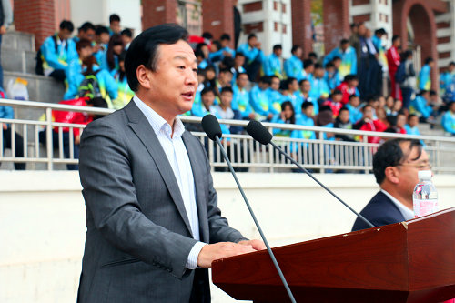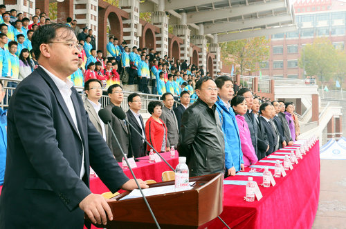 校党委书记薛允洲宣布黄岛校区2014级新生运动会开幕,校党委副书记杨向荣致开幕词,副校长李东致闭幕词。体育部主任沙洪成主持。运动员代表、裁判员代表先后宣誓,表示要努力做到尊重对方、尊重裁判,赛出风格、赛出水平,友谊第一,比赛第二;表示要严格履行裁判员职责,做到严肃、认真、公正准确,确保运动会顺利进行。