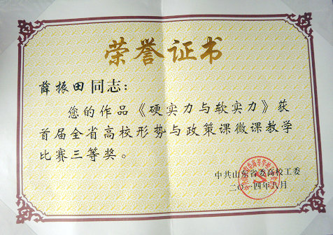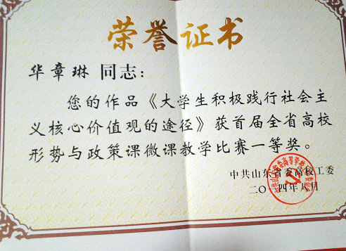 日前,由中共山东省委高校工委和中宣部《时事报告》杂志社主办、山东省高校形势与政策课专业委员会承办的山东高校首届“形势与政策课”微课教学比赛揭晓,伟德官网人文学院华章琳老师的作品《大学生积极践行社会主义核心价值观的途径》获一等奖,薛振田老师的作品《硬实力与软实力》获三等奖。