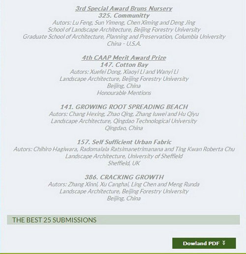 本次竞赛面向全世界风景园林院校征集作品,是代表全球风景园林设计专业最高水平的大学生设计竞赛,它旨在鼓励学生参与并更深地认识风景园林规划设计工作,通过尝试来解决未来可能出现的各种观点及挑战,促进国际风景园林学科的发展,为人类创造更加美好的生存环境。最终全球范围入围25组优秀学生设计作品,其中有美国哥伦比亚大学、清华大学、英国谢菲尔德大学和北京林业大学等国内外景观名校。