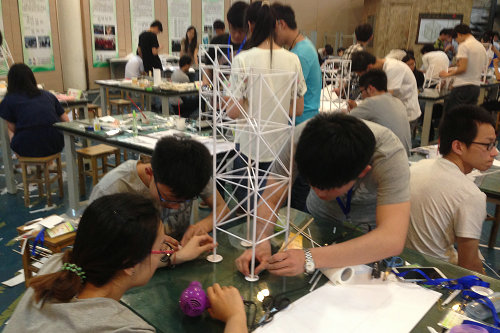 本次竞赛赛题要求各参赛队设计并制作一空间结构,结构下部埋入砂中,对上部结构进行加载测试。模型的加载分为三级,一级为150N竖向荷载,二级为30N水平静荷载,三级为水平冲击荷载。模型对参赛队员的结构概念、传力路径和计算能力、现场制作能力等提出了更高的挑战。通过结构的设计和制作,使学生在结构知识运用能力、创新能力、动手能力和团队协作精神等方面得到全面提升。