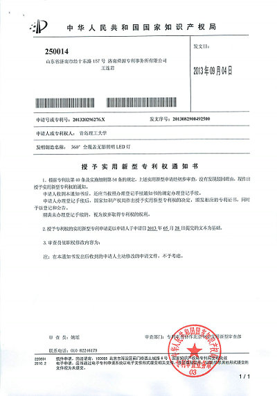 近日,在环境学院周广生老师的指导下,设备111班杨枫光等同学成功获得一项实用新型国家专利,专利名称为360全覆盖无影照明LED灯。