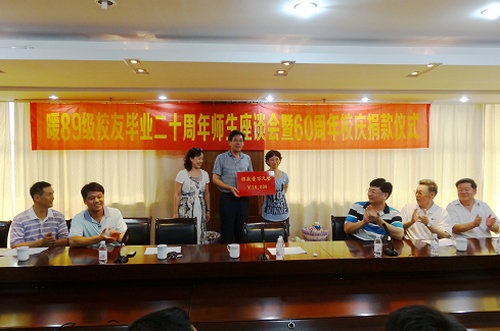 8月17日,暖通89级校友毕业20年座谈会暨向母校六十年校庆捐款仪式在图书科技楼会议室举行。副校长杨兴昌代表学校接受捐赠。环境学院党总支书记董典同、原环工系老领导、班主任老师及专业老师代表应邀参加。