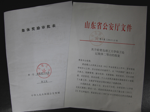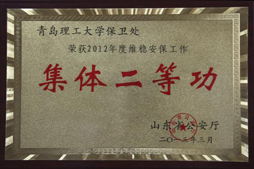 2012年度治安保卫工作中,在学校党委行政的的领导下,保卫处紧紧围绕学校中心工作,以“平安校园”建设为工作重点,创新管理,完善措施,狠抓落实,在校园管理、治安防范、综合治理、十八大安保及敏感时期维稳等方面做了大量工作,在学校各部门各学院的积极支持下,为维护学校安全稳定作出了显著成绩,被山东省公安厅授予“集体二等功”。