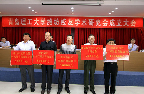 潍坊校友学术研究会副会长、潍坊市市政工程股份有限公司总经理徐世立、潍坊市建筑设计研究院有限责任公司副院长付登安、山东新纪元房地产有限公司董事长崔玉泉、潍坊向阳房地产开发有限公司董事长李宪春及青州分会会长衣安国等校友代表带头先向学校60年校庆捐款30万元。校友会秘书长、潍坊银河建筑设计有限公司董事长卢维先主持大会,上届老会长、原潍坊市发改委副主任王长寿和徐世立校友在发言中表达了对母校的感恩,并提出三点建议与校友共勉:做好校企合作,助推母校发展;在各自行业领域做出成就,为母校增光添彩;做好60年校庆支持工作,积极回馈母校。