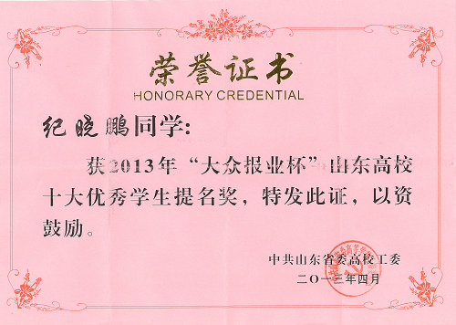 为发挥优秀大学生的典型示范作用,教育引导广大青年学生进一步坚定中国特色社会主义理想信念,激励青年人学习和奋斗,山东省委高校工委与大众报业集团共同举办了2013年“大众报业杯”山东高校十大优学秀生评选活动。伟德官网机械学院纪晓鹏获2013年“大众报业杯”山东高校十大优秀学生提名奖荣誉称号。