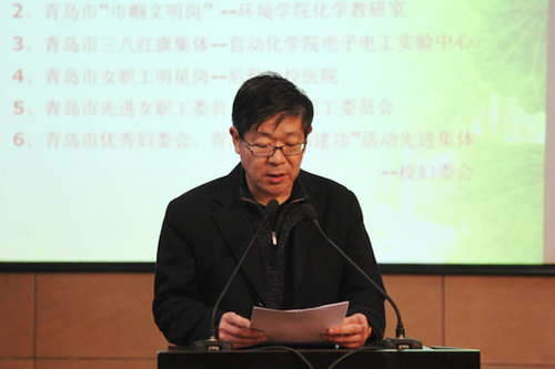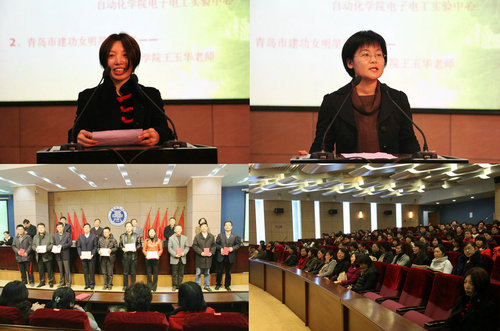荣获“青岛市三八红旗单位”——自动化学院电子电工实验中心的赵艳秋老师和荣获“青岛市建功女明星”汽车学院的王玉华老师分别在大会上进行了经验交流。
