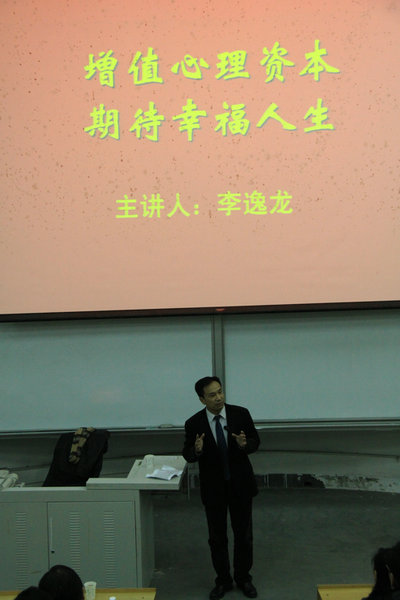李逸龙教授首先以物质资本、人力资本、社会资本的重要性为铺垫,引出心理资本的积累才是认知自我最有价值的资源。其后,他还详细讲解了心理资本的“希望、自信、乐观、复原力”四大要素,并对“幸福”的体验做了很生动的诠释。李逸龙的演讲充满哲理性和启发性,整个演讲过程,气氛活跃,掌声不断。大家都被他的睿智和乐观所深深感染,并使大家重新认识了心理资本,为寻找生活、工作的幸福感开启了心灵的一扇窗。