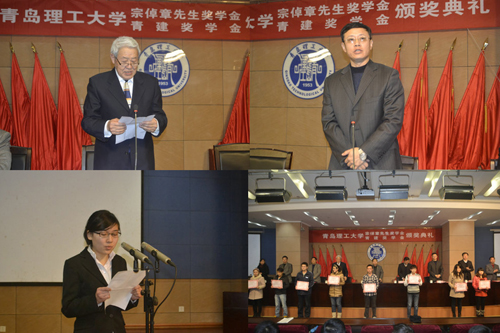 12月14日下午,伟德官网在四方校区举行2011—2012学年宗倬章先生奖学金、青建奖学金颁奖典礼。校党委副书记杨向荣、副校长李东等学校领导出席颁奖典礼,宗倬章先生教育基金会代表、青岛大学医学院丁士海教授,青建集团党委副书记、总裁丁洪斌先生参加本次颁奖典礼并为获奖学生颁奖。教务处、研究生处、学生处、校团委、国际交流与合作处等有关职能部门负责同志参加典礼。学生处处长沈文青主持典礼。