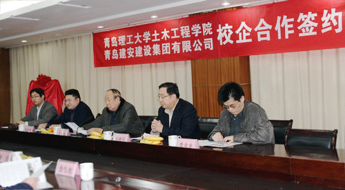 土木学院党总支书记张明义首先简要介绍了土木学院的综合情况,他表示学院将进一步加强校企合作,在科研项目及人才培养方面更好地为企业服务,实现学院与企业优势互补、互利共赢。青岛建安建设集团董事长杨建强在致辞中对校企合作的意义给予充分肯定,希望双方今后能够发挥各自优势在多方面深入开展具体的合作。卢举林会长高度评价了此次校企合作,这种强强联合适应了高校人才培养和现代化企业内在发展的要求,产学研的结合对提高学校人才培养质量、促进企业健康发展都具有重要意义,希望双方密切合作,相互促进,结出校企合作的累累硕果。